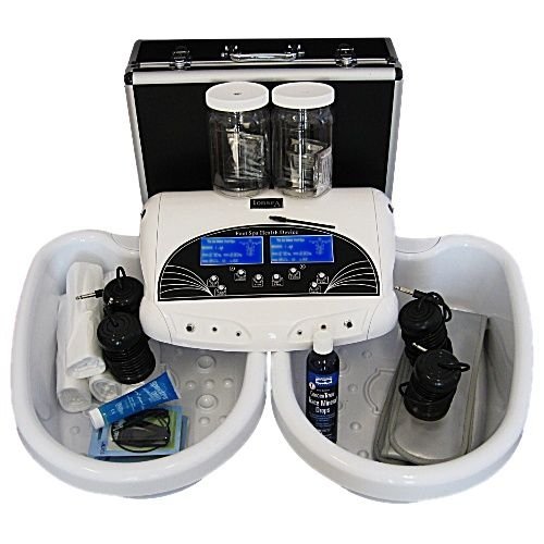 Your HEALTHandMED Foot Bath System Includes: *Free Detox Consultation. *Free health assessment. *Two 304-type stainless steel ion activator probes (arrays) *Two Bamboo charcoal FAR Infrared waist belts *TWO LCD Screens - no more toggling back and forth during a two-person session *Carrying Case for Dual Ionic Detox Machine, Arrays and Other Accessories - Simplifies transport of your system from house to house or business to business *Two wrist straps *Tube of conductive wrist strap gel *Long Power cord *Operating Instructions written by HEALTHandMED *14 Page Booklet with protocols, best practices and background info on ionic detox *Warranty covering defects in material and workmanship for one year What Makes This Ionic Foot Bath Better Than All the Others? 1)Two systems in one-two people can enjoy the experience of detoxifying together 2)Far Infrared Therapy Function - Two great therapies in one! During foot detox sessions, you can also use the FIR belt to relieve muscle aches, increase the cell's activities and accelerate blood circulation. FIR belt may also be used independent of ionic detox. 3)Powerful-operates at 100 Watts, 15 Volts and 1.0 - 2.5 Amps 4)User friendly -- includes a treatment time control and ion intensity control. 5)Operates from 220 volt and 110 volt power sources (can use worldwide) 6)Safe to operate. Also includes an 8oz Bottle of Concentrace Trace Mineral Drops to help replenish good minerals after a detox session.